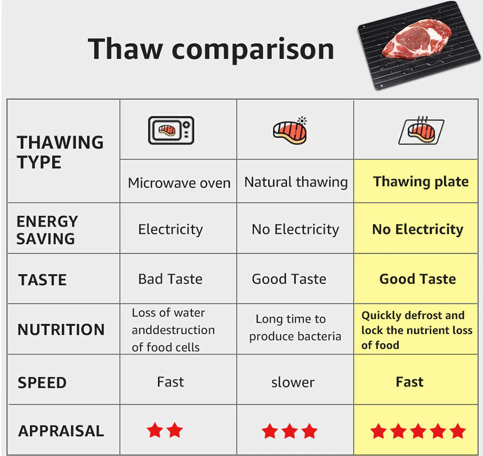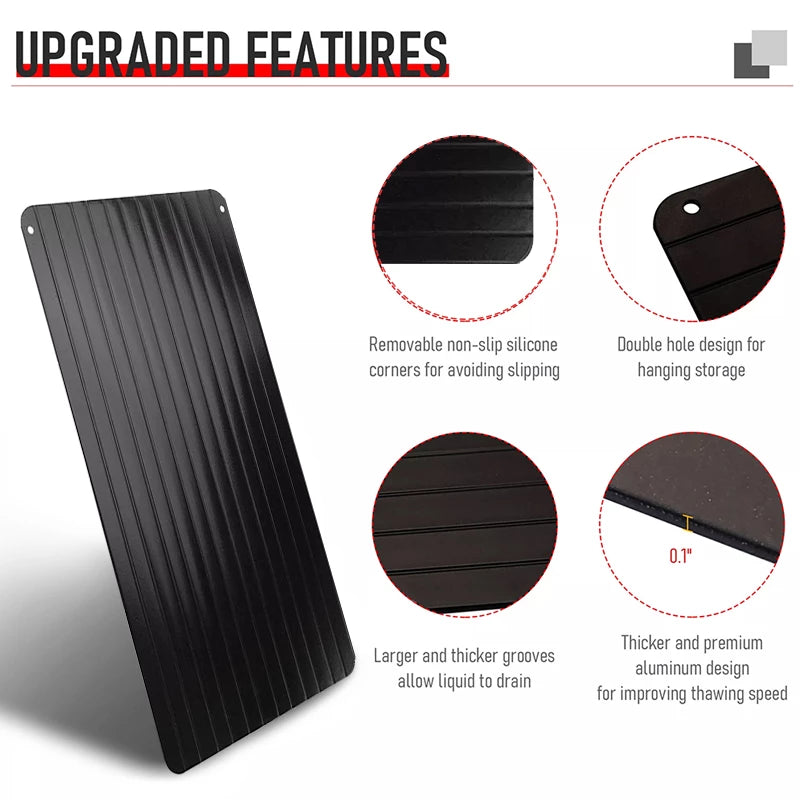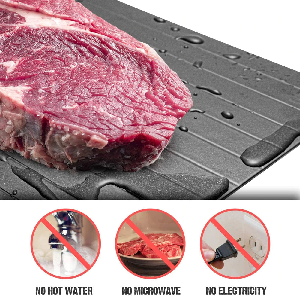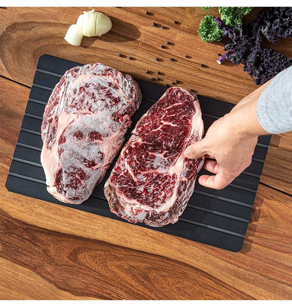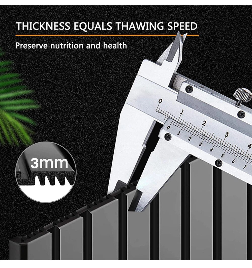 Fast Defroster Tray er lavet af førsteklasses termisk ledende aluminium for at fremskynde optøningsprocessen, optøningshastigheden er 8 gange hurtigere end ved stuetemperatur. Du behøver ikke længere spekulere på, hvordan du optør din mad på få minutter! Imperial Home Quick Defrosting Tray lader dig hurtigt og naturligt optø dit frosne kød eller mad. Du behøver ikke at bruge mikrobølgeovn til at optø dit frosne kød, læg det bare på den super optøningsbakke og se magien.